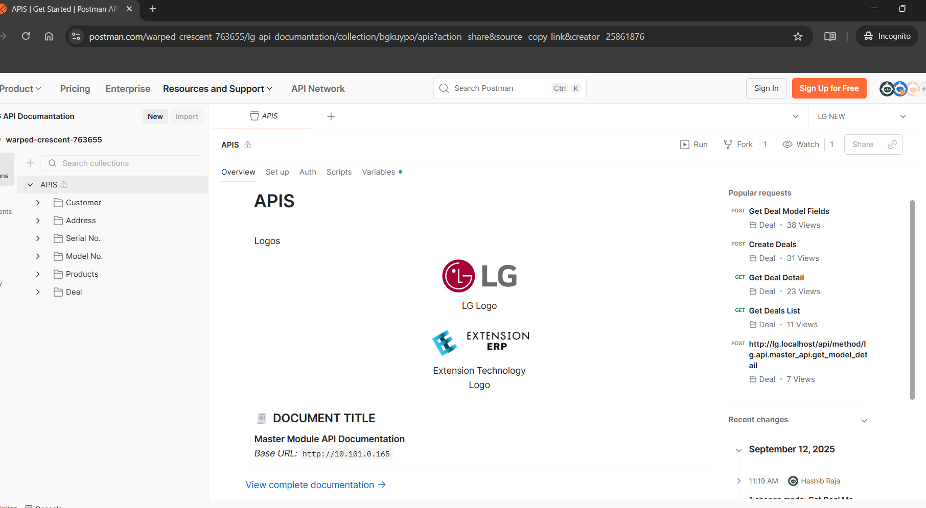 /home/extension/frappe-bench/apps/lg/lg/api/master_api.pyPostman documentation / collection (shared):
