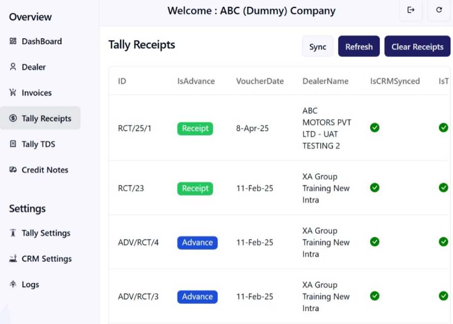 tally.service.js → fetchReceipts()Transforms into CRM-compatible JSON.