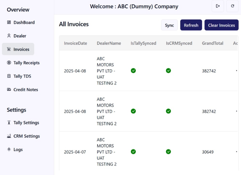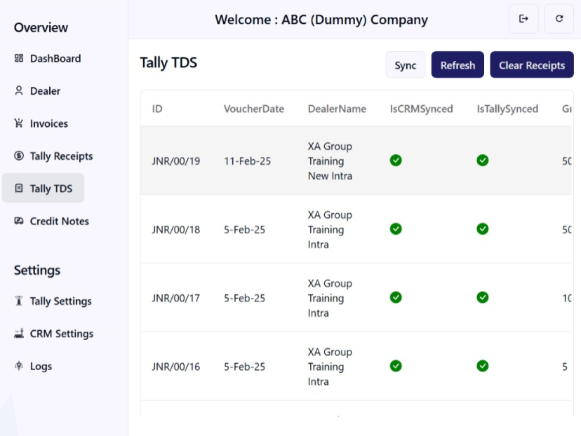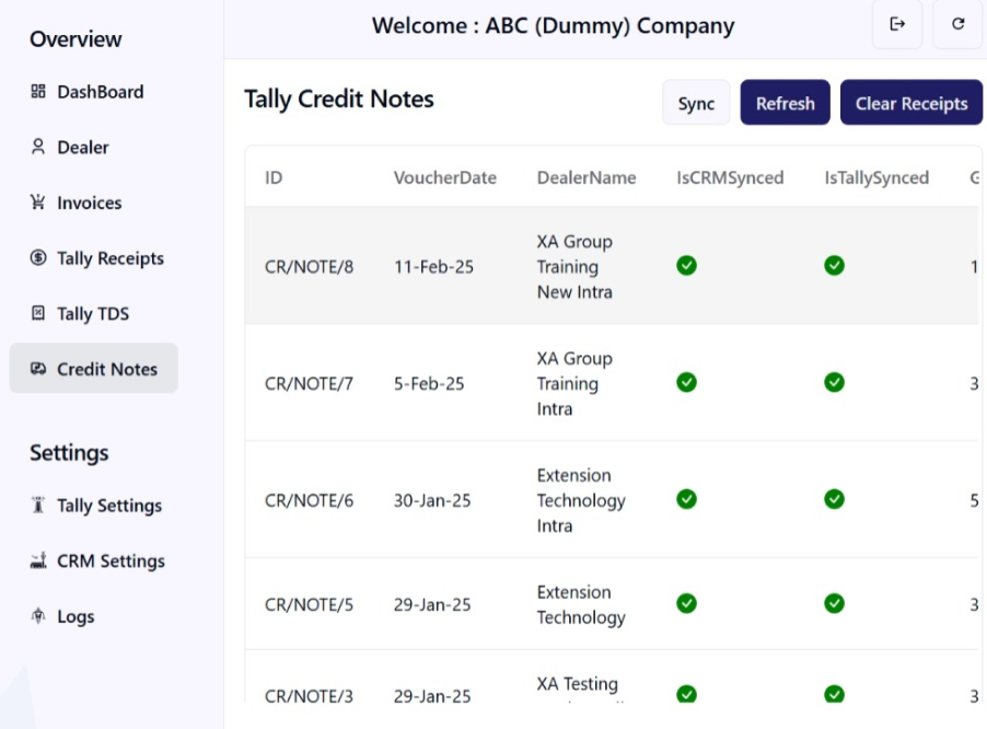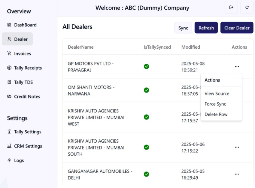 crm.service.js→ pushes dealer data to Tally.tally.service.js→ creates Ledger under Sundry Debtors in Tally.Status (